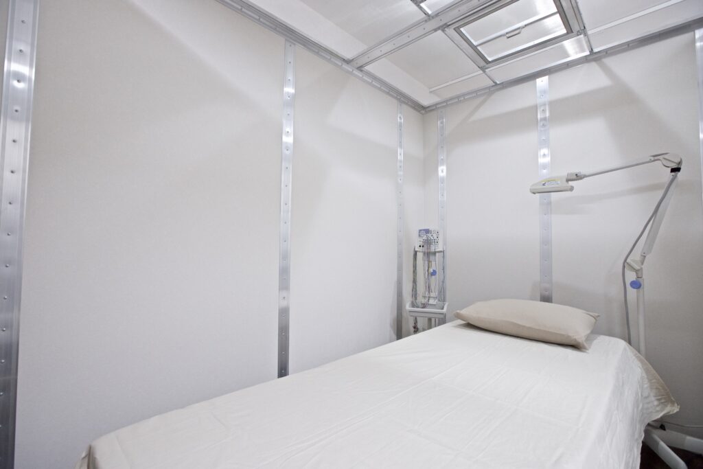 2 検査の準備 | 頭皮にクリーム状のペーストで電極を付けていきます。検査はベッドに横になった状態で行ないます。 |